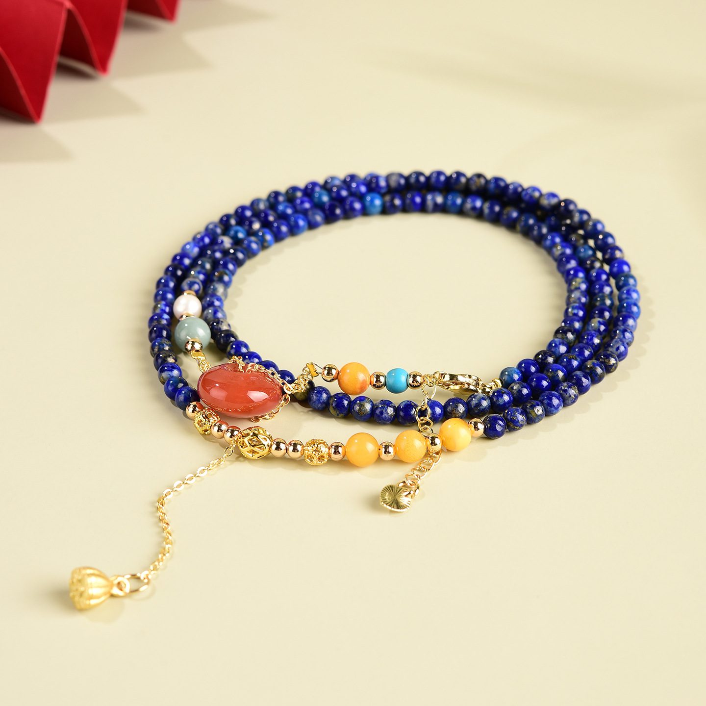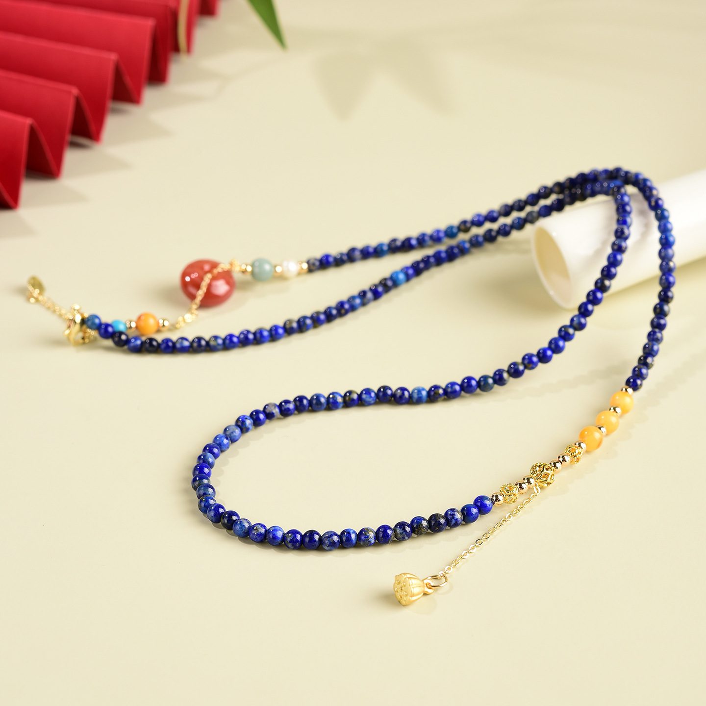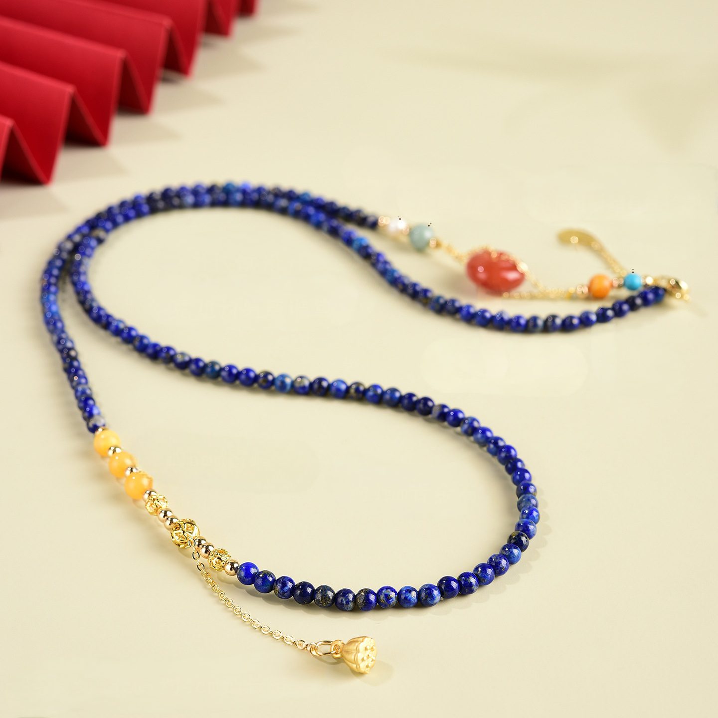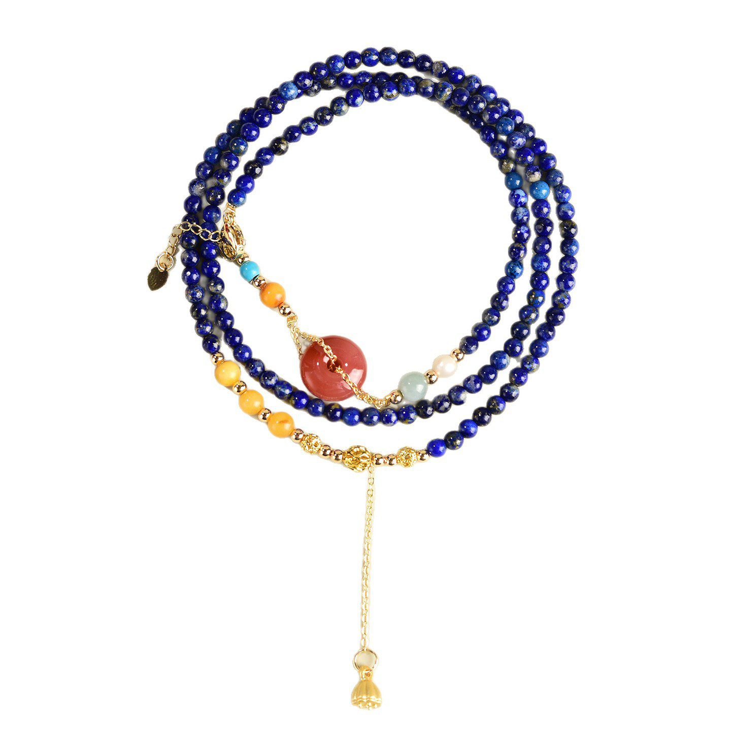 14K Gold-Plated Accents: Hypoallergenic, tarnish-resistant gold-plated beads, lotus bell tassel, and clasps, ensuring long-lasting shine and skin safety.