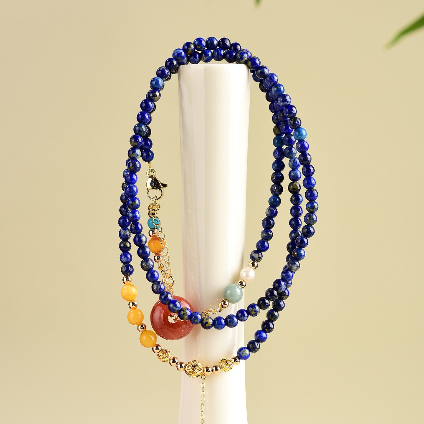 Natural Beeswax Amber (≈5mm beads): A symbol of warmth and prosperity, beeswax amber is said to bring good luck, ward off negative energy, and soothe anxiety. Its warm golden tone balances the cool blue of lapis lazuli, creating a harmonious visual effect.