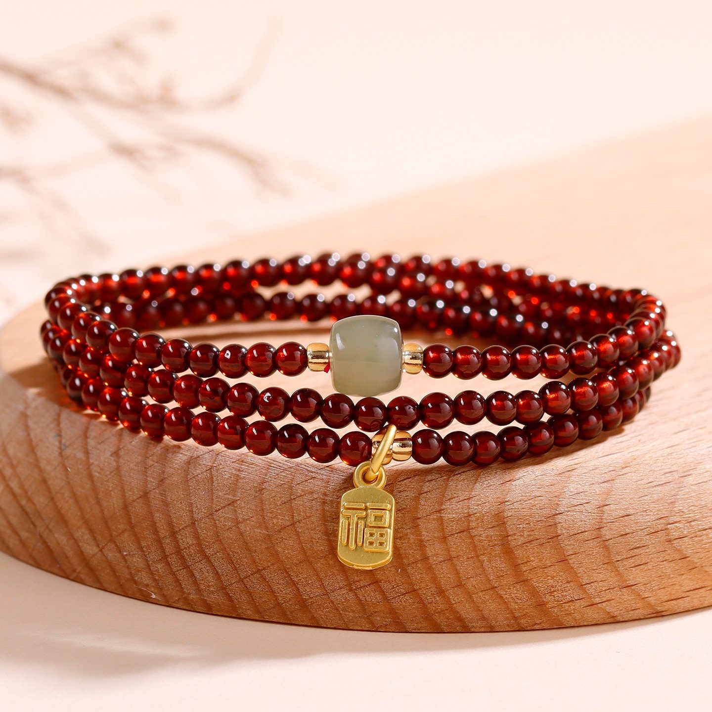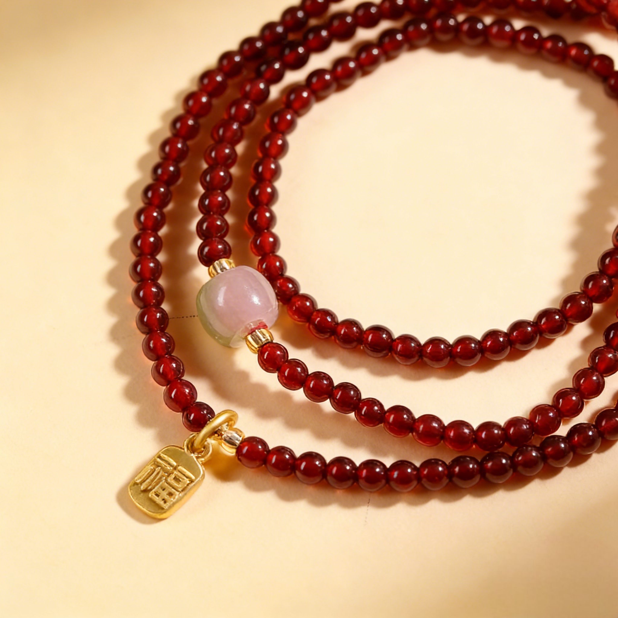 Crafted with natural garnet, rose quartz and Hetian jade, this original Chinese-style three-loop bracelet is paired with an exquisite blessing pendant. Garnet helps to boost vitality, awaken inner strength and dispel mental fatigue. Rose quartz attracts positive connections, heals inner anxiety and brings peace and relaxation. Hetian jade carries gentle good fortune, guards your mind and blesses you with Eastern metaphysical luck. The three-loop design highlights a layered look, perfect for daily wear, infusing you with healing energy.
