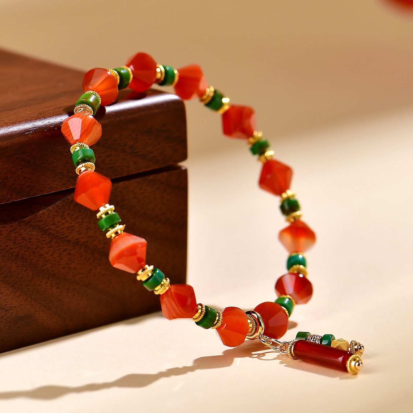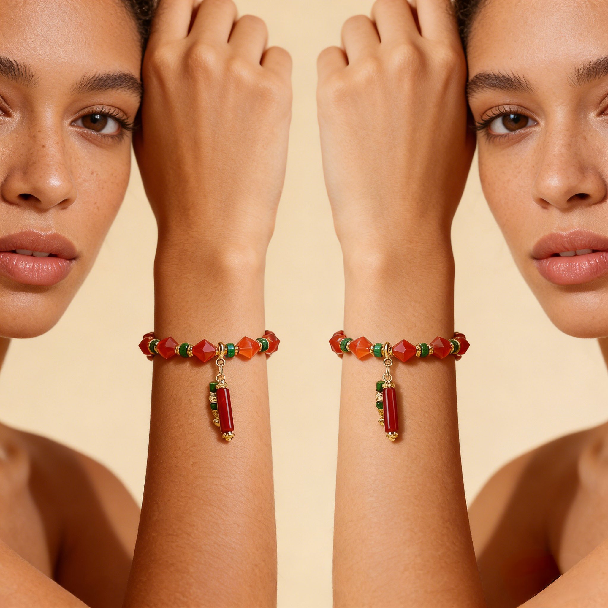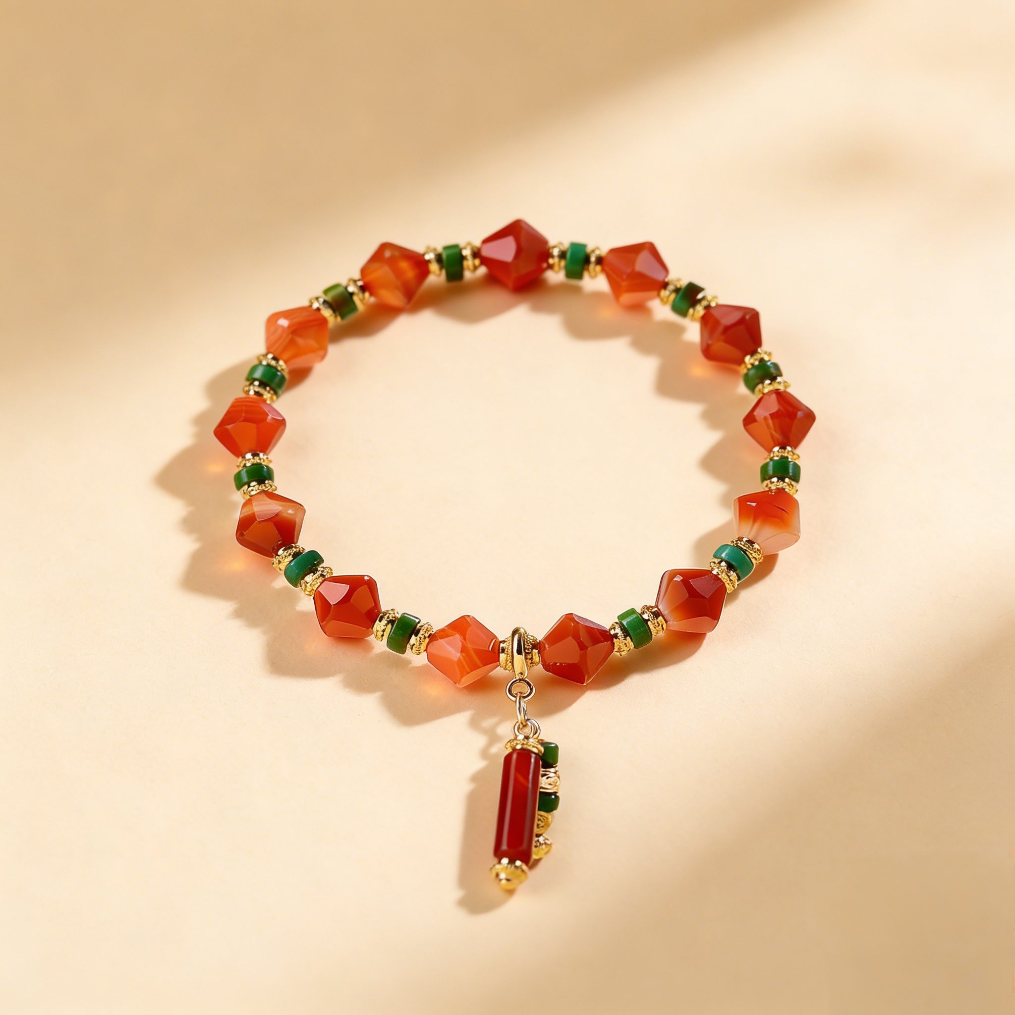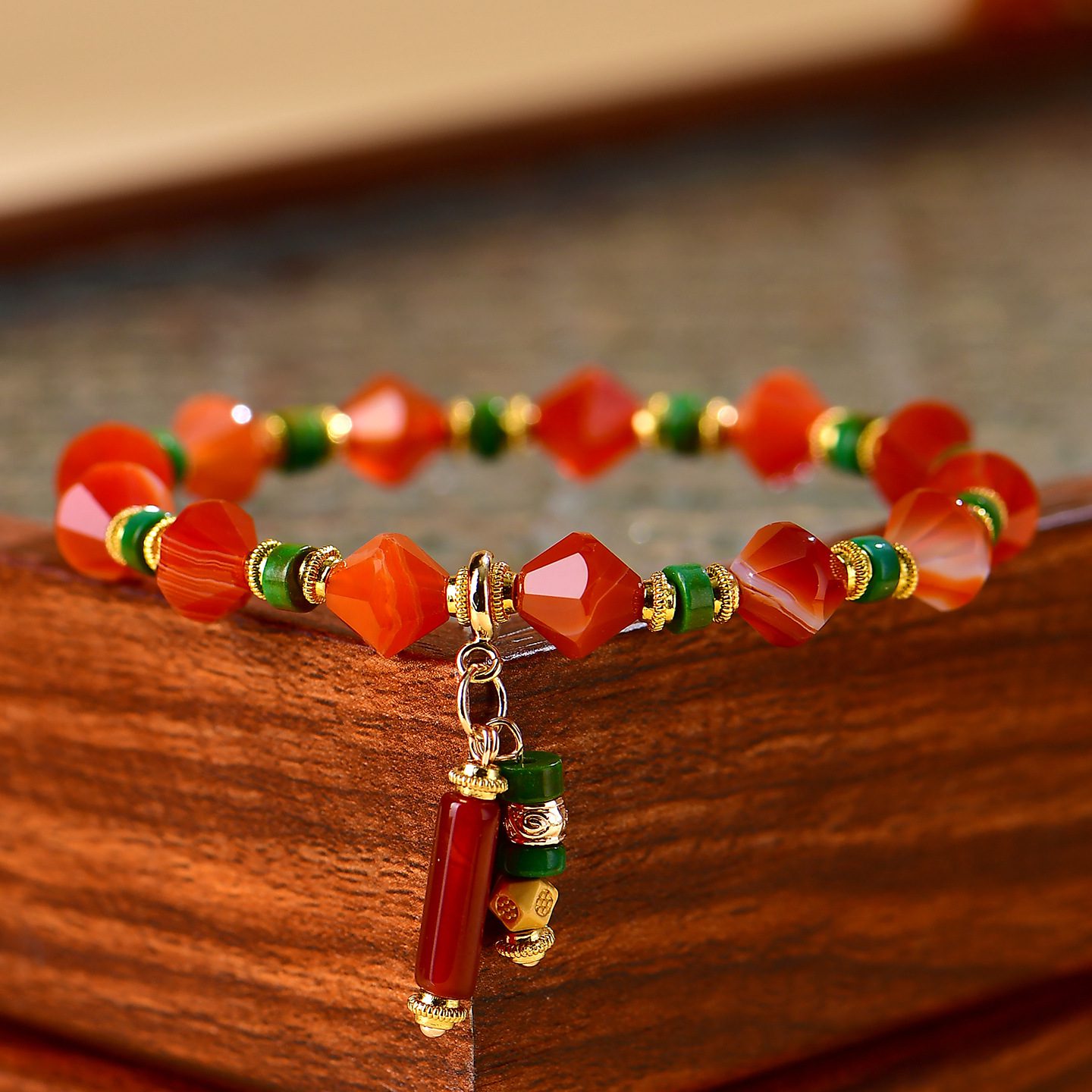 Made of natural faceted red agate and green jade, this bracelet features a niche color-blocking design that is both vintage and lively. Red agate corresponds to the root chakra, awakening physical energy, dispelling mental burnout, and bringing you stable inner strength. Green jade relieves tension, soothes anxious thoughts, and helps you find inner peace. The unisex style fits all outfits, wearing it daily can enhance your positive aura and guard your peace of mind