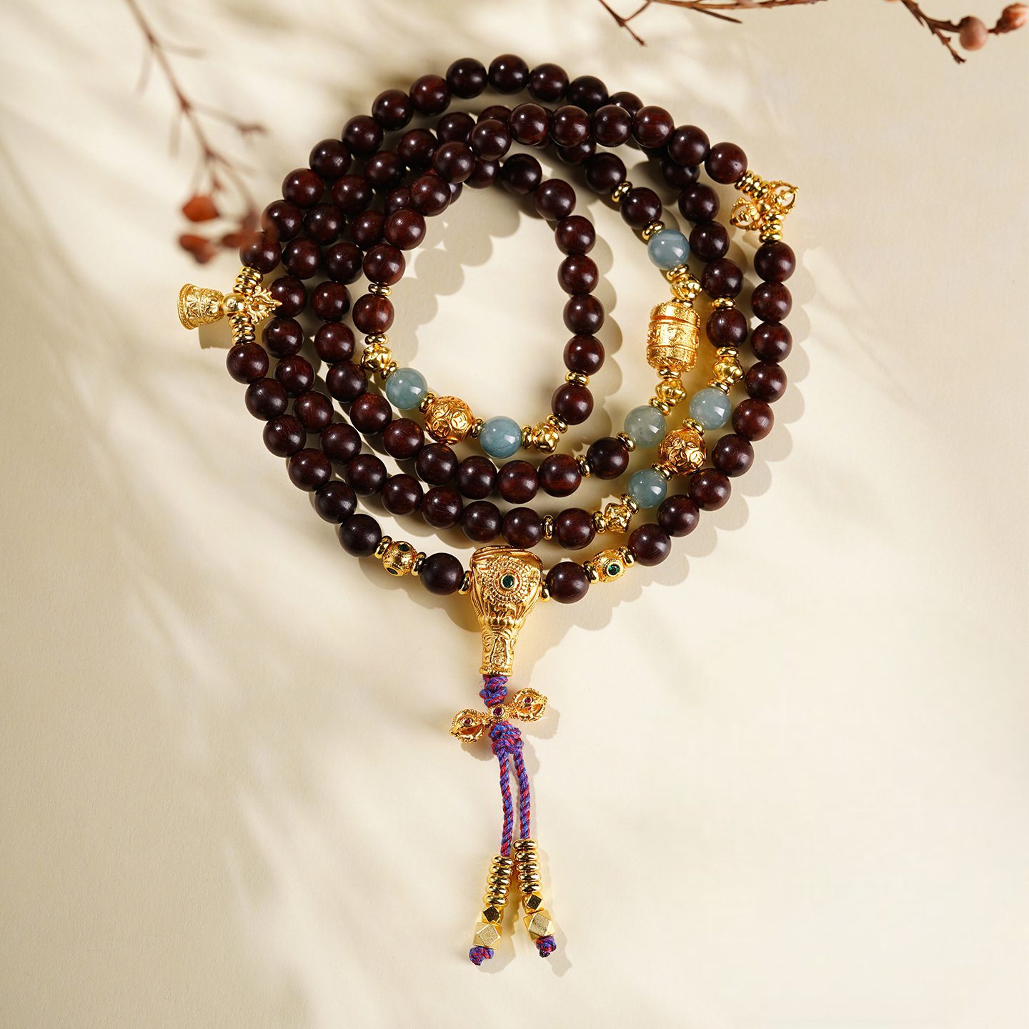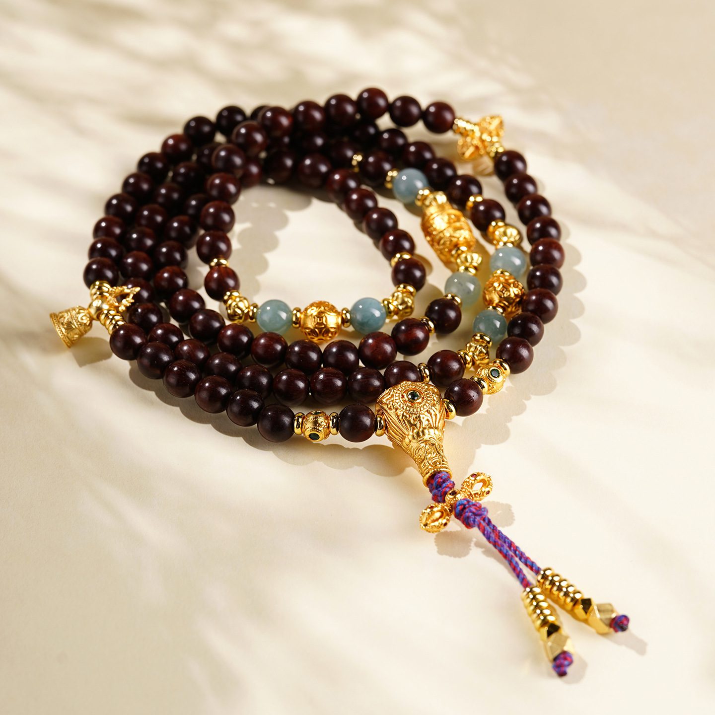 Vintage Gold-Plated Accents: Intricately designed 14K gold-plated Buddhist accessories, including a guru bead, dharma wheel charms, and tassels, with enamel inlay for a luxurious, antique palace-style finish. Hypoallergenic and tarnish-resistant, ensuring long-lasting shine.